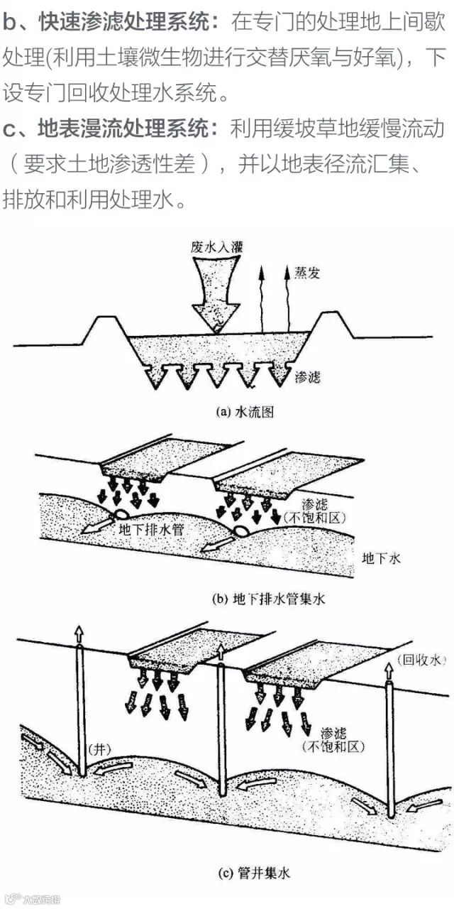 土地处理法主要有灌溉、漫灌和高灌率渗透三个方法。