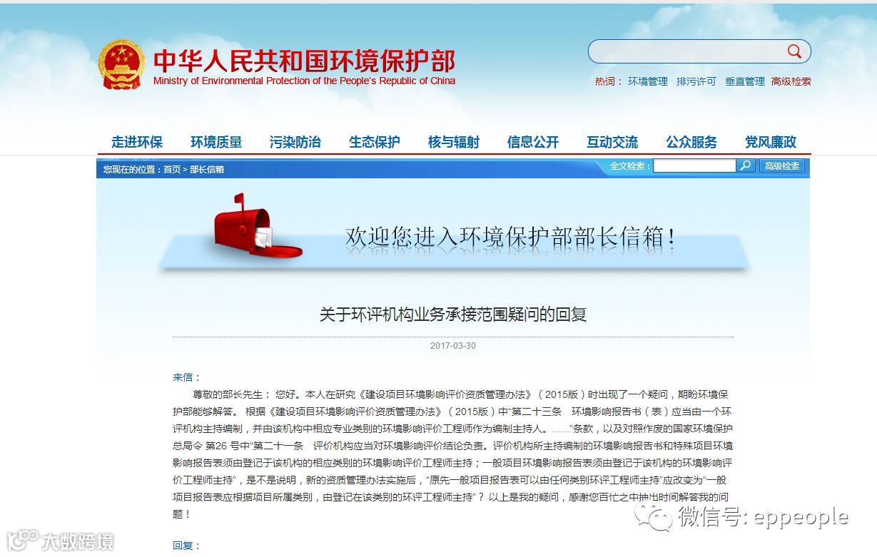 你发给我部网站“部长信箱”的“关于环评机构业务承接范围的疑问”的来信收悉。经研究,现答复如下: