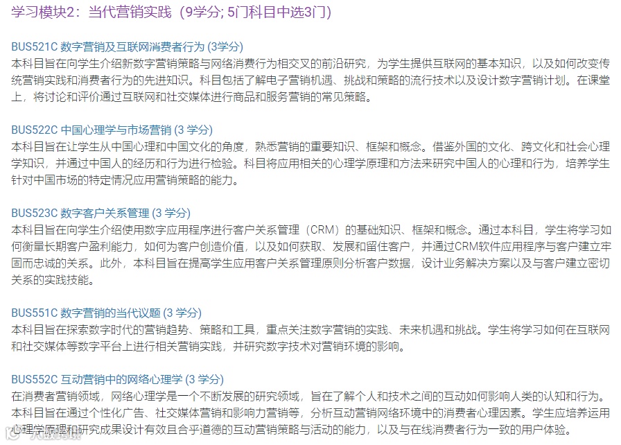 申请人必须于本科学习时曾修读定量分析方法和市场营销科目。如果申请人之前没有学习过上面所述任何一门科目,需要参加以下衔接科目: