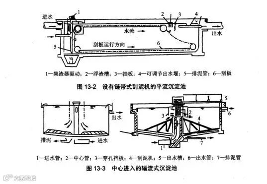 (3)辐流式池:最适宜于大型水处理厂采用,有定型的排泥机械,运行效果较好,但要求较高的施工质量和管理水平;