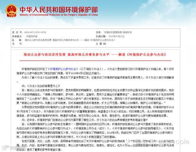 环境保护部近日印发了《环境保护公众参与办法》(以下简称《办法》)。《办法》是自新修订的《环境保护法》实施以来,首个对环境保护公众参与做出专门规定的部门规章,将于2015年9月1日起正式施行。