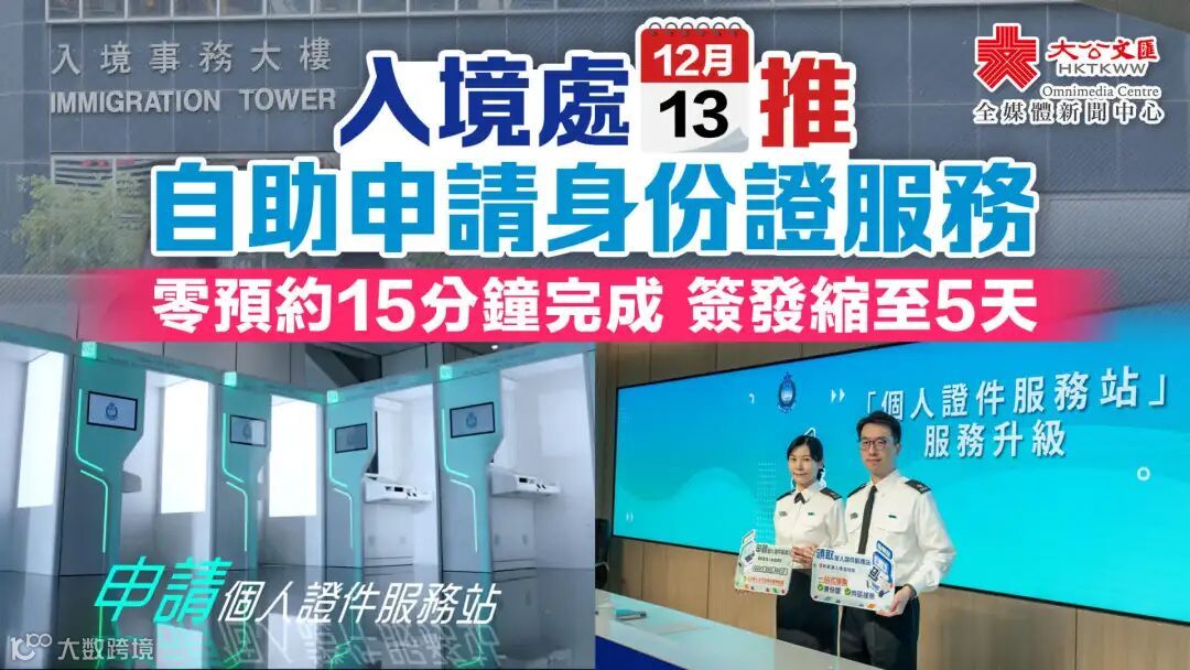 上周五,香港入境处正式推出自助申请香港身份证服务,合资格的申请人可以全自助形式办理登记身份证的手续,以及透过「申请个人证件服务站」一站式办理身份证和香港特区护照申请,无需亲自面见入境处主任办理有关手续。同时,使用「申请个人证件服务站」办理身份证和特区护照,无需事先预约。