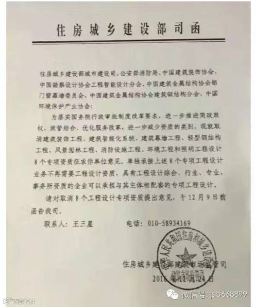 住房和城乡建设部市场监管司与2016年11月24日发函对取消8个工程设计专项资质征求意见,8个工程设计专项包括:建筑装饰工程,建筑智能化系统,建筑幕墙工程,轻型钢结构工程,照明工程,消防设施工程,风景园林工程和环境工程。