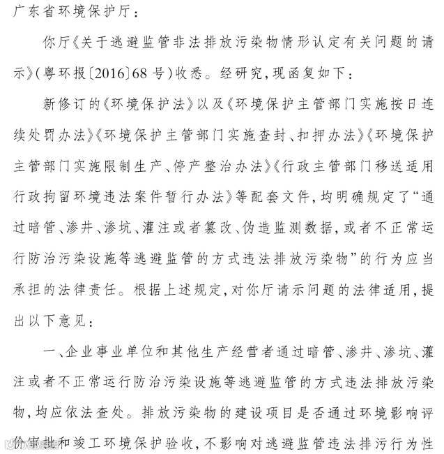 你厅《关于逃避监管非法排放污染物情形认定有关问题的请示》(粤环报【2016】68号)收悉。经研究,现函复如下: