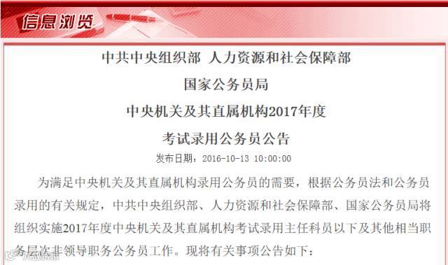 2017年国家公务员考试公告全文已经正式发布。中央机关及其直属机构2017年度考试录用公务员专题网站(http://bm.scs.gov.cn/2017)