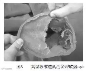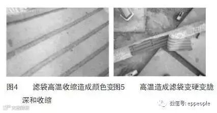 高温烟气对滤袋的另外一种损害是高温收缩,虽然每种滤料的使用温度不同,但当烟气温度超过其使用温度后,如其经向收缩率过大,会使滤袋在长度方向上尺寸变短,滤袋袋底紧托着骨架并受力而损坏(如图3)。如果滤袋纬向热收缩过大,将使滤袋在径向尺寸变小,滤袋会紧紧箍在骨架上,甚至无法抽出骨架。从而使滤袋一直处于受力状态,造成滤袋的收缩变形、变硬、变脆,加快强度耗损、减短滤袋寿命。由于滤袋变形后会紧紧箍在骨架上,在清灰时滤袋难以变形而不利于喷吹清灰,导致滤袋阻力居高不下。