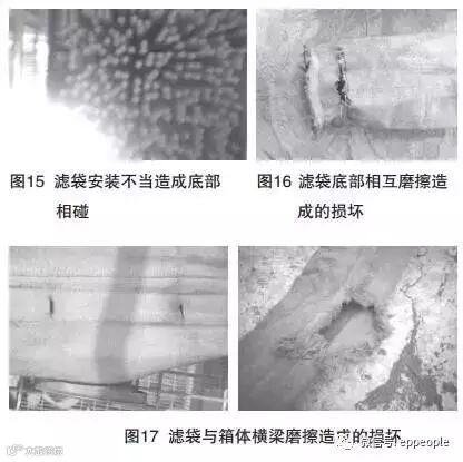 滤袋安装不良,会由于花板、骨架等原因不与花板 相垂直(如图15);如果过于偏斜就会造成滤袋底部相 互磨擦而损坏(如图16);滤袋与壁板及滤袋与箱体横 梁间也会由于磨擦而造成滤袋损坏(如图17)。