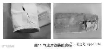 过高的过滤气速会使粉尘冲击、磨损滤袋,也会使 滤袋的织物纤维张力受损。除尘器的进气分布不均,容 易使高含量的大颗粒粉尘直接冲击局部滤袋,造成废气 进口处部分滤袋穿孔(如图11)。