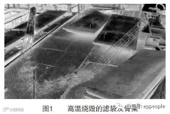 高温对滤袋的损害是致命的。如黑龙江某煤粉干燥窑,由于干燥后煤粉颗粒非常细小又特别粘,清灰不理想,使滤袋表面存留大量的干燥后的煤粉,而这种干燥后的煤粉,燃点又非常低,当高温烟气进入除尘器后,会迅速点燃滤袋表面的煤粉,导致整台除尘器的滤袋及骨架全部被烧毁(如图1)。从图1可以看出,滤袋表面残留大量的干燥后的煤粉,从其左上角也可见箱体被烧毁。