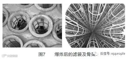 随着袋式除尘器的普及,袋式除尘器粉尘爆炸事故也呈上升趋势。如上海某钢厂的干熄焦除尘系统,由于前部阻火墙制造的问题,造成火星进入除尘器内从而引起爆炸,将除尘器进口管道盲板炸出几十米远,除尘器箱体严重变形。又如沈阳某机制炭厂,由于锯末在炭化过程中产生大量的焦油和碳氢化合物等易燃、易爆物质,而且焦油粘在滤袋上随着时间推移越积越多,当有火星进入除尘器后就引起了除尘器爆炸。除尘器爆炸瞬间所产生的能量可使花板严重变形,滤袋爆裂情况见图7。
