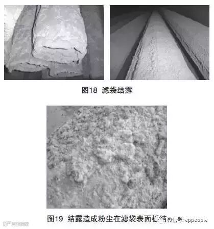结露是袋式除尘器运行中最常见问题(如图18), 水分是滤袋结露的最大原因,造成滤袋含有水分的原因 通常是低温发生凝露,尤其在处理燃烧或高温烟气时,当滤袋表面的初始粉尘层含有水分,干燥后就会使粉尘 凝结、板结(如图19)。