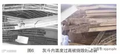 高温粉尘被收入灰斗后,如果不能及时排出,粉尘会长期蓄积在灰斗里造成灰斗内温度不断升高,滤袋长期在高温烘烤下就会变脆、变硬,严重时则会烧毁,尤其是粉尘中含有的易燃物质,会在灰斗内燃烧,从而烧毁滤袋(如图6)。