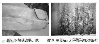 纤维氧化是纤维中分子失去(或离解)电子的过程,如PPS纤维,在高温(150℃)条件下氧分子攻击分 子中的“S”,并与之结合。造成PPS纤维变色、变硬、 变脆,强度降低而破损,严重时纤网会破碎而脱离基布 (如图10)。氧化是滤袋损坏的又一主要因素。抗氧化 性能较差的滤料主要有:聚丙烯、聚苯硫醚(PPS)等。