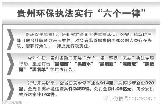 据介绍,早在2014年,贵州省就在全省启动了“六个一律”环保“利剑”专项执法行动。今年年初,贵州省政府将“利剑”行动提升为“六个一律”环保“风暴” 执法专项行动,以打击“黑烟囱”“黑废水”“黑废油”“黑废渣”“黑数据”“黑名单”等“六黑”环境违法犯罪行为为重点,对环境违法案件分类采取刑事审判 一批、行政拘留一批、行政处罚一批、停业关闭一批、挂牌督办一批等“五个一批”分类处理。