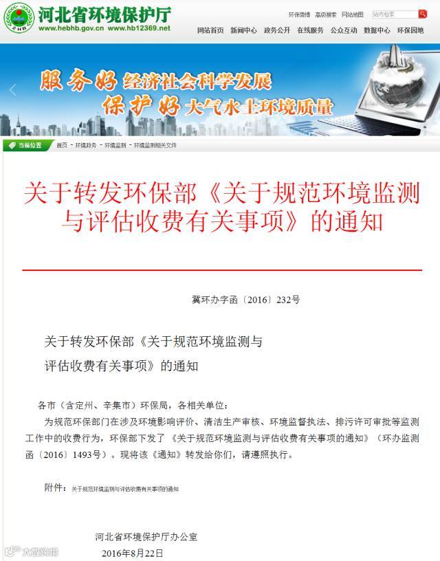 为规范环保部门在涉及环境影响评价、清洁生产审核、环境监督执法、排污许可审批等监测工作中的收费行为,环保部下发了 《关于规范环境监测与评估收费有关事项的通知》(环办监测函〔2016〕1493号)。现将该《通知》转发给你们,请遵照执行。