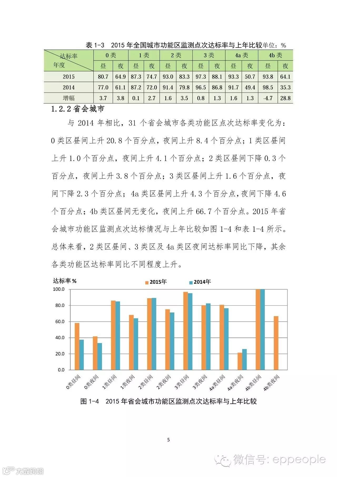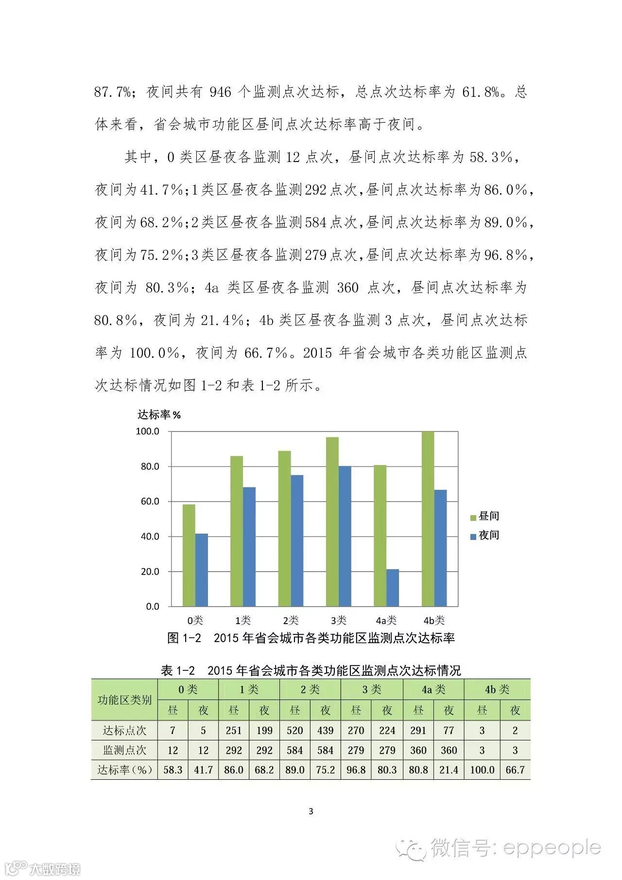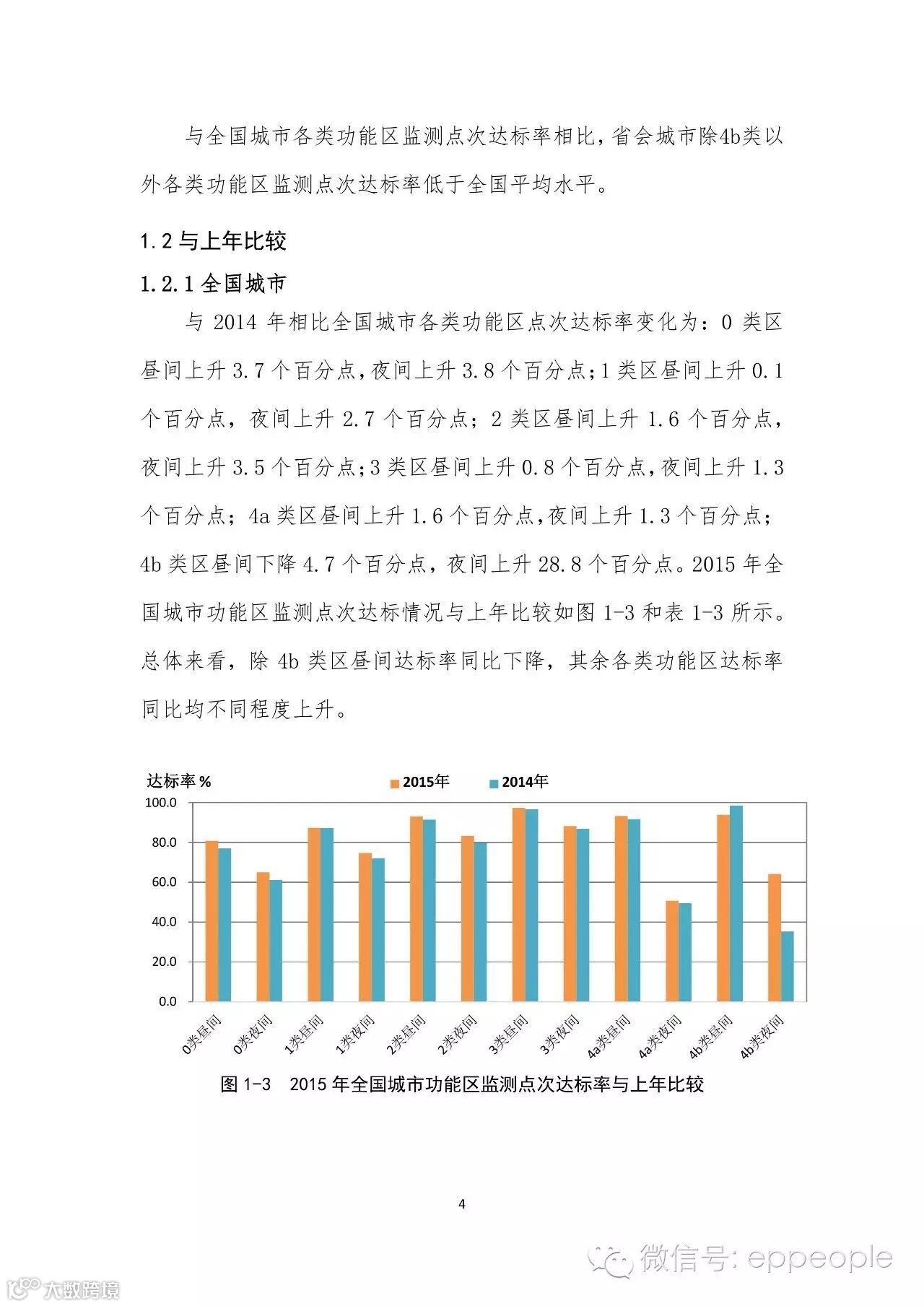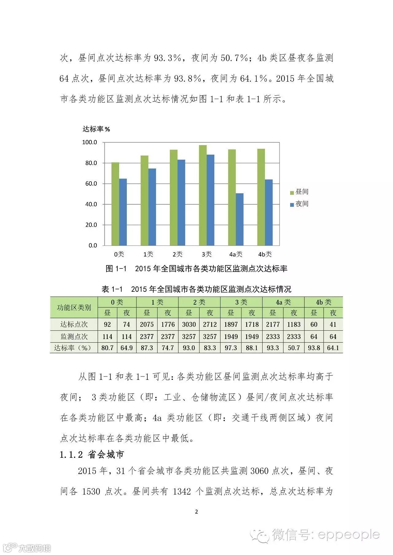 其中,0 类区昼夜各监测 114 点次,昼间点次达标率为 80.7%, 夜间为 64.9%;1 类区昼夜各监测 2377 点次,昼间点次达标率为 87.3%,夜间为 74.7%;2 类区昼夜各监测 3257 点次,昼间点次达 标率为 93.0%,夜间为 83.3%;3 类区昼夜各监测 1949 点次,昼间 点次达标率为 97.3%,夜间为 88.1%;4a 类区昼夜各监测 2333 点次,昼间点次达标率为 93.3%,夜间为 50.7%;4b 类区昼夜各监测 64 点次,昼间点次达标率为 93.8%,夜间为 64.1%。2015 年全国城 市各类功能区监测点次达标情况如图 1-1 和表 1-1 所示。