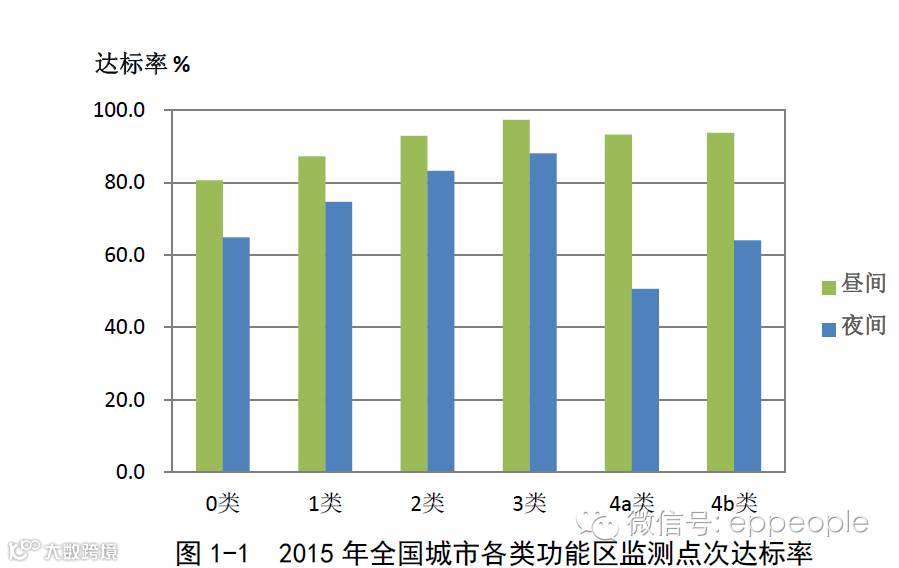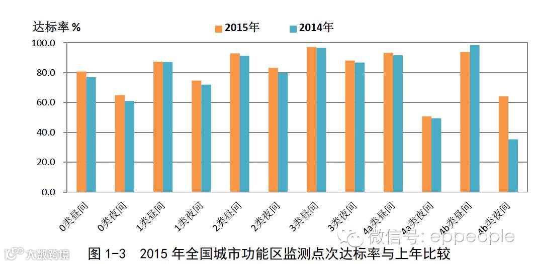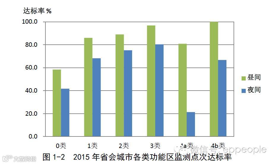 从图 1-1 和表 1-1 可见:各类功能区昼间监测点次达标率均高于