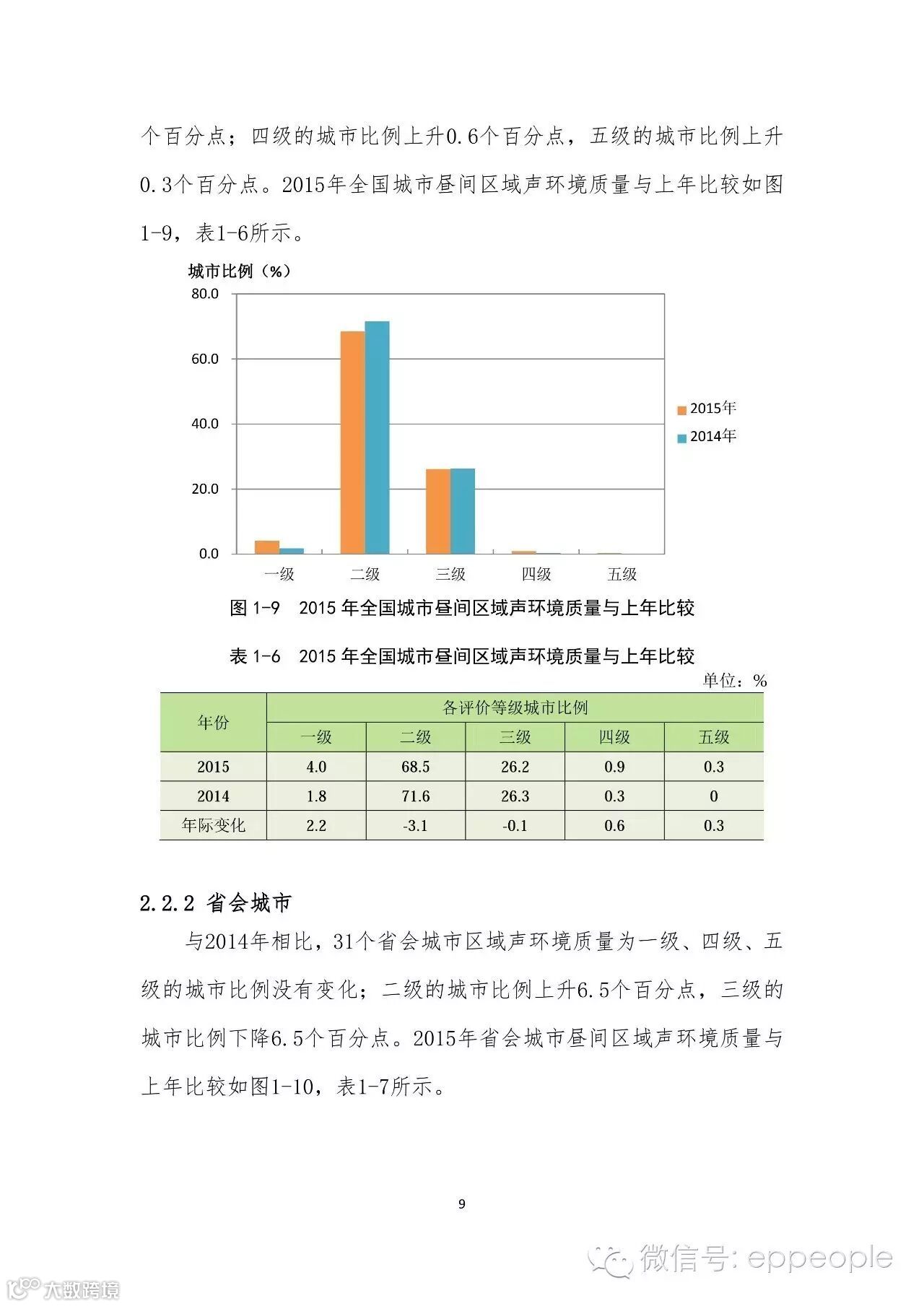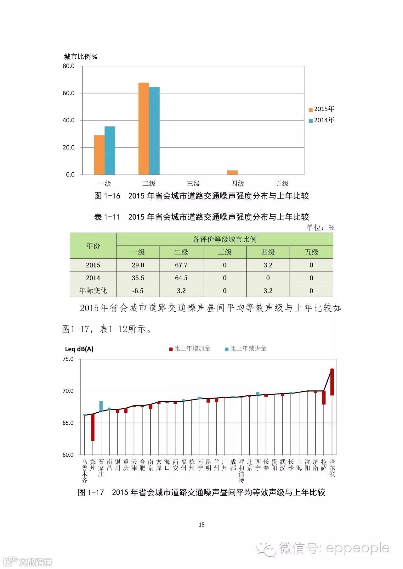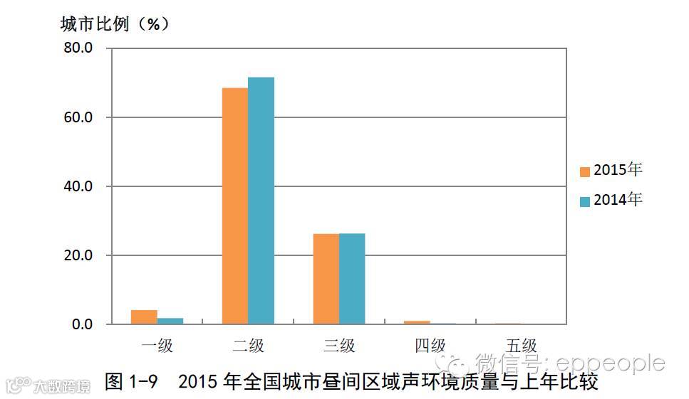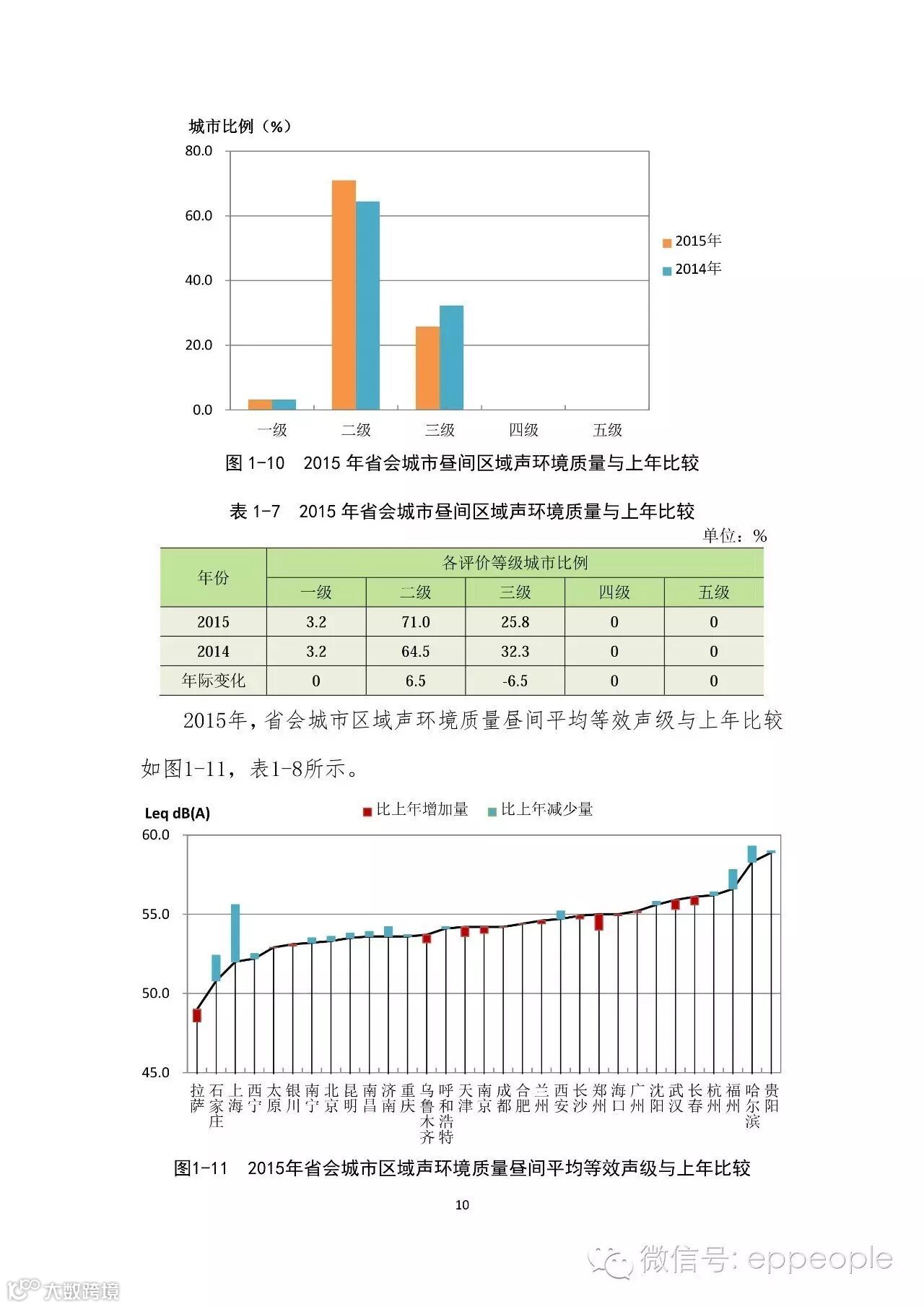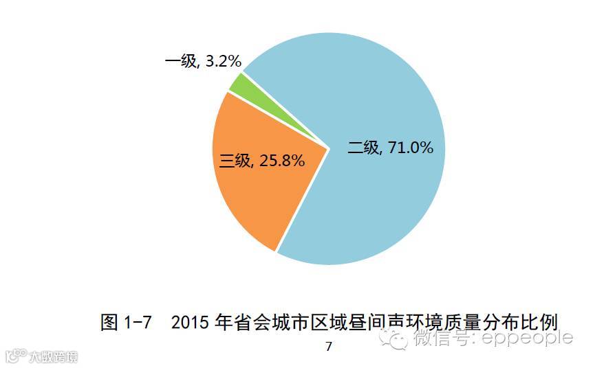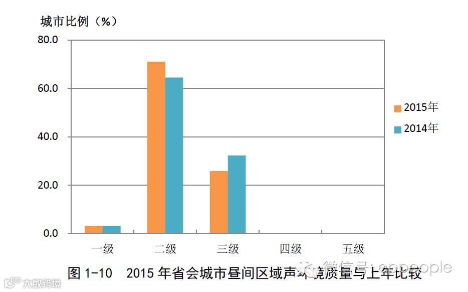 与2014年相比,31个省会城市区域声环境质量为一级、四级、五 级的城市比例没有变化;二级的城市比例上升6.5个百分点,三级的 城市比例下降6.5个百分点。2015年省会城市昼间区域声环境质量与 上年比较如图1-10,表1-7所示。