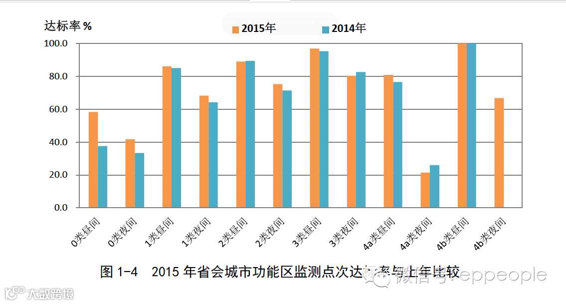 2015 年,全国共有 308 个地级及以上城市开展了功能区声环境质量监测,各类功能区共监测 20188 点次,昼间、夜间各 10094 点次。 昼间共有 9331 个监测点次达标,总点次达标率为 92.4%;夜间共有 7504 个监测点次达标,总点次达标率为 74.3%。总体来看,全国城市 功能区声环境质量昼间点次达标率高于夜间。
