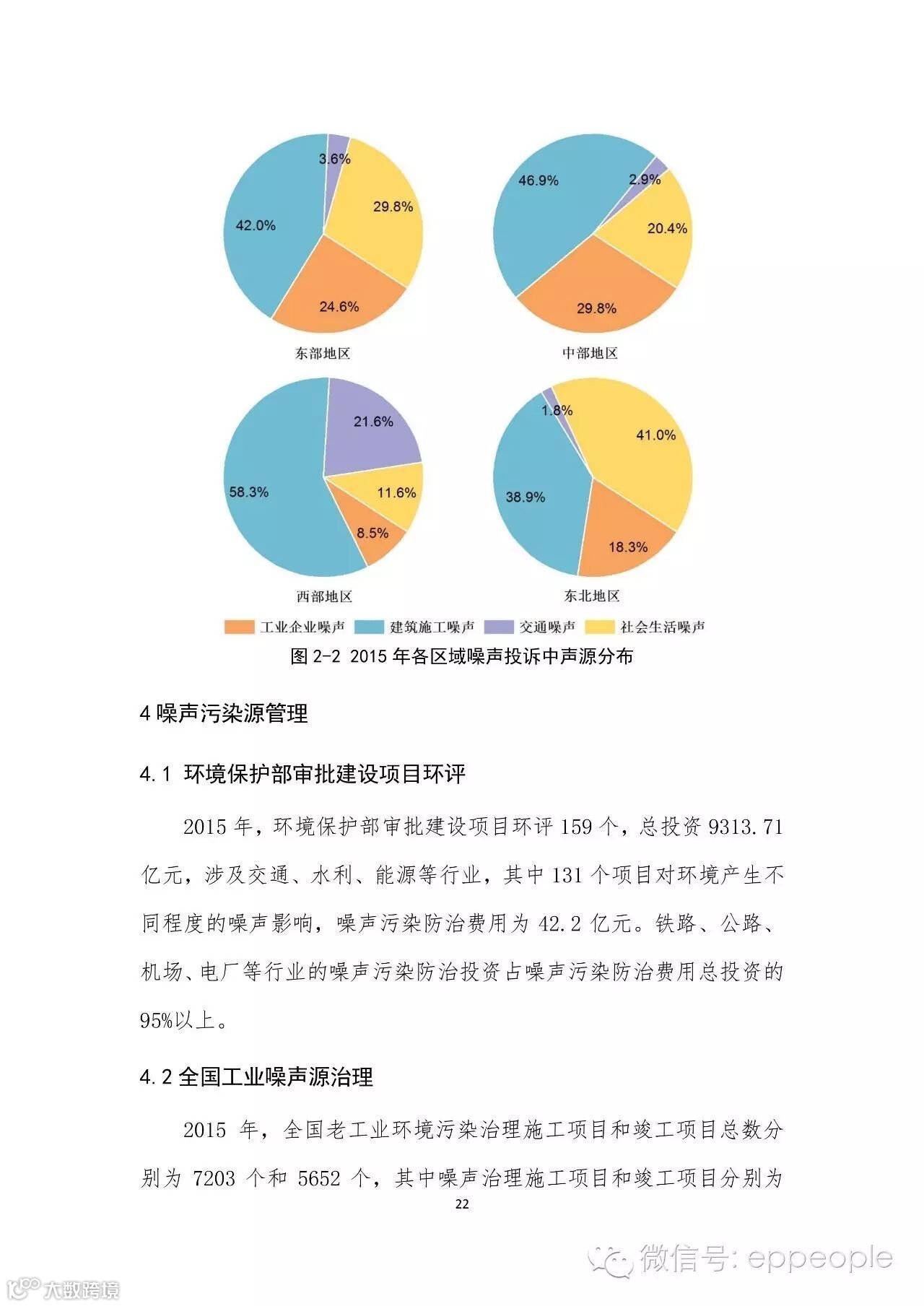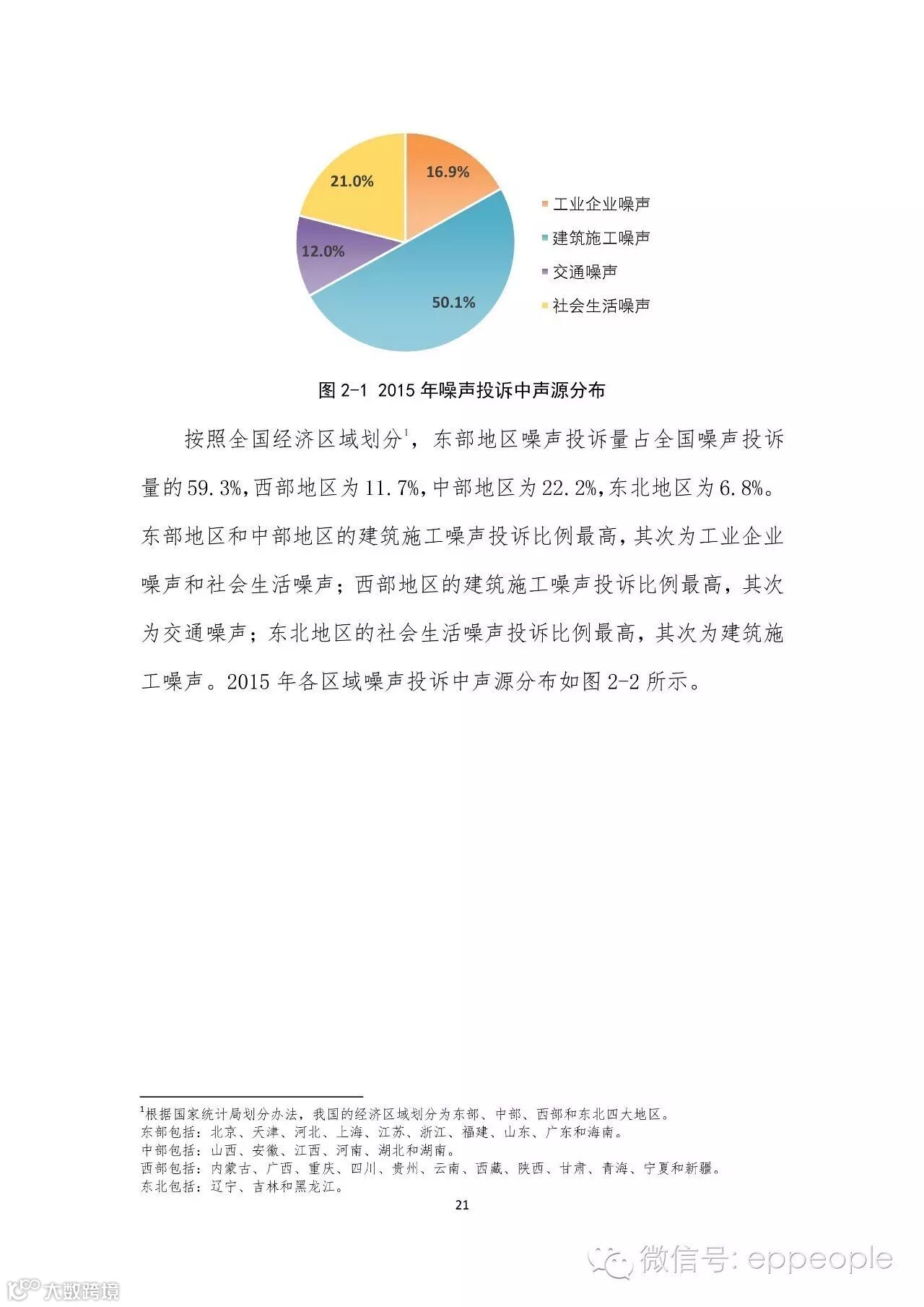 2015 年,全国各省(区、市)环保部门共收到环境噪声投诉 35.4 万件(占环境投诉总量的 35.3%),办结率为 99.5%。其中,工业企业 噪声类占 16.9%,建筑施工噪声类占 50.1%,社会生活噪声类占 21.0%, 交通噪声类占 12.0%。2015 年,环境保护部审批建设项目环评 159 个,其中有 131 个。项目对环境产生不同程度的噪声影响,噪声污染防治费用为 42.2 亿元。全国老工业噪声污染治理施工项目和竣工项目总数分别为 86 个和 76 个,噪声污染治理投资总计为 2.79 亿元。