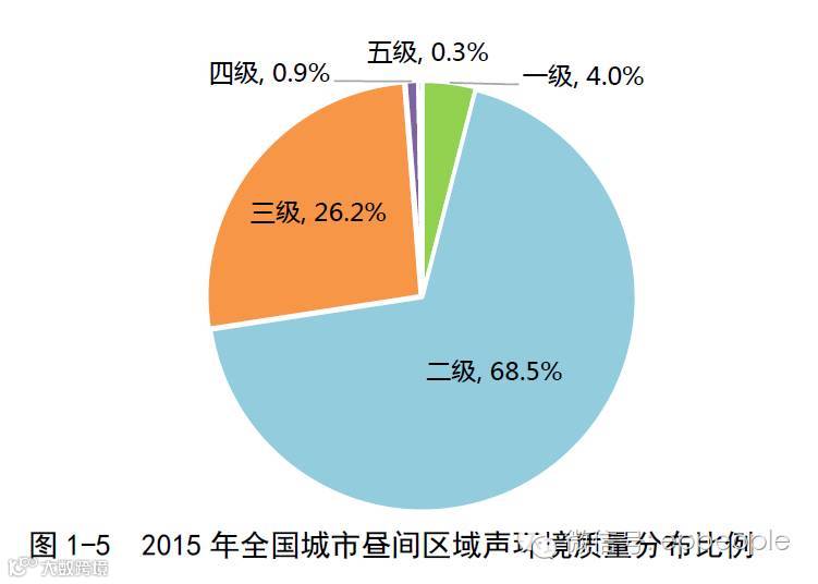 其中,道路交通噪声强度评价为一级的城市为212个,占65.4%; 二级的城市为96个,占29.6%;三级的城市为9个,占2.8%;四级的城 市为7个,占2.2%。2015年全国城市道路交通噪声强度分布比例如图 1-12所示。