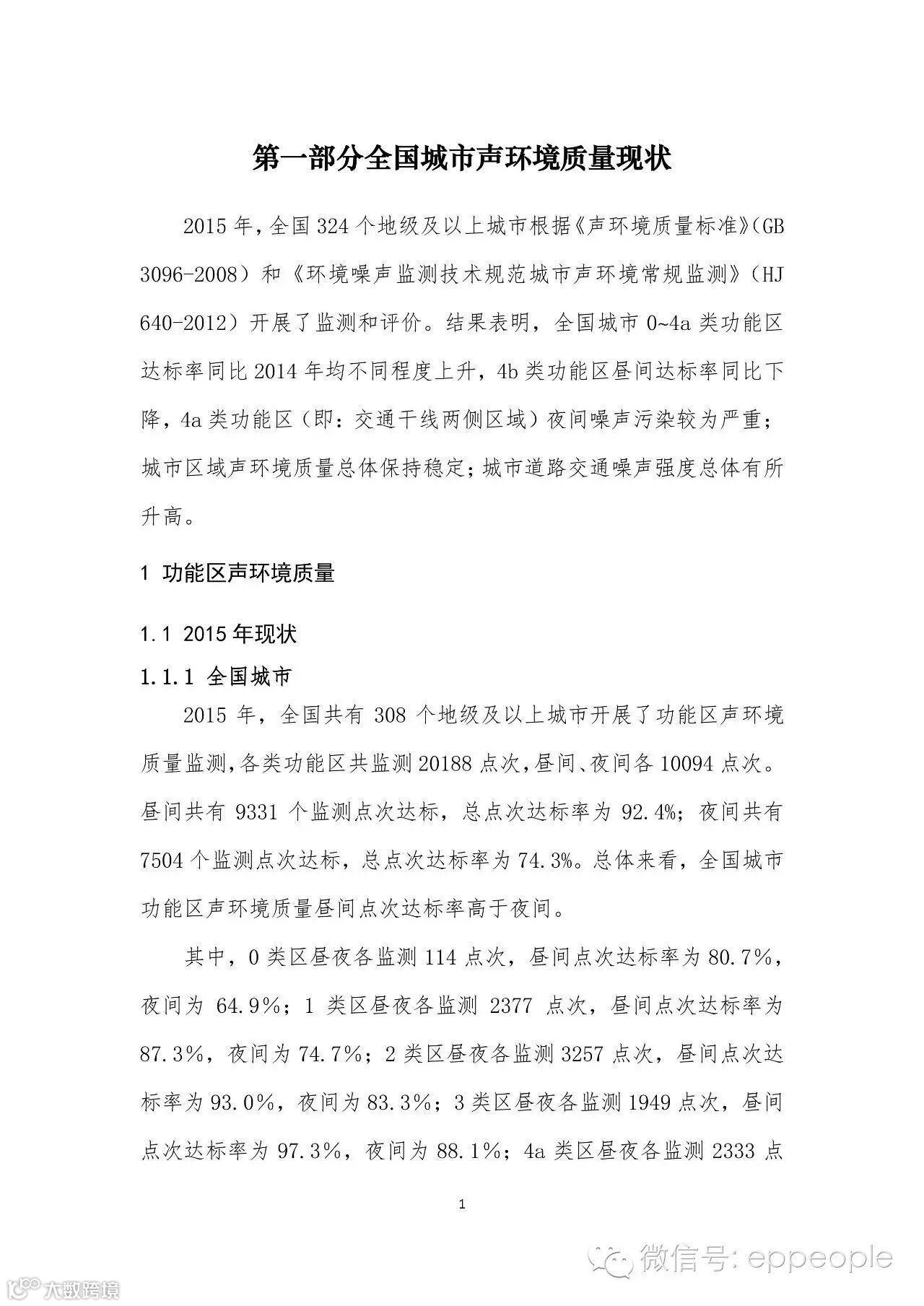 2015 年,全国 324 个地级及以上城市根据《声环境质量标准》(GB3096-2008)和《环境噪声监测技术规范城市声环境常规监测》(HJ640-2012)开展了监测和评价。结果表明,全国城市 0~4a 类功能区 达标率同比 2014 年均不同程度上升,4b 类功能区昼间达标率同比下 降,4a 类功能区(即:交通干线两侧区域)夜间噪声污染较为严重; 城市区域声环境质量总体保持稳定;城市道路交通噪声强度总体有所 升高。