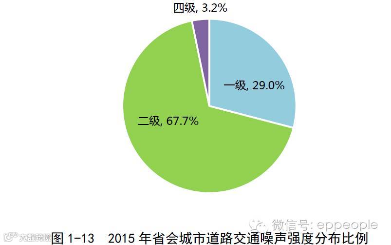 其中,道路交通噪声强度评价为一级的城市为9个,占29.0%;二 级的城市为21个,占67.7%;四级的城市为1个,占3.2%。2015年省会 城市道路交通噪声强度分布比例如图1-13所示。