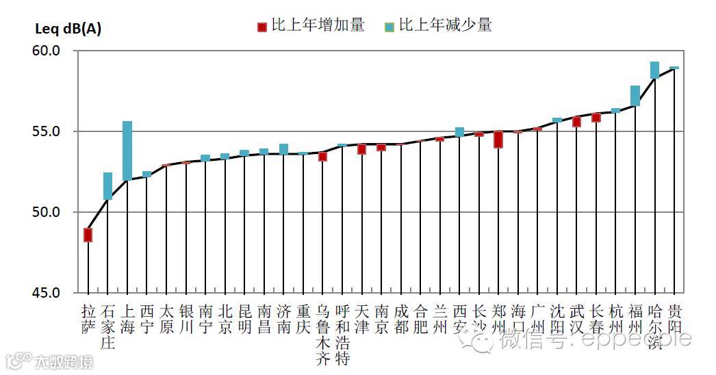 2015年,省会城市区域声环境质量昼间平均等效声级与上年比较 如图1-11,表1-8所示。