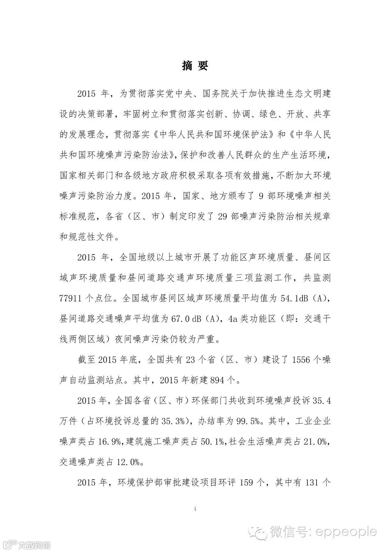 2015 年,为贯彻落实党中央、国务院关于加快推进生态文明建 设的决策部署,牢固树立和贯彻落实创新、协调、绿色、开放、共享 的发展理念,贯彻落实《中华人民共和国环境保护法》和《中华人民 共和国环境噪声污染防治法》,保护和改善人民群众的生产生活环境, 国家相关部门和各级地方政府积极采取各项有效措施,不断加大环境 噪声污染防治力度。2015 年,国家、地方颁布了 9 部环境噪声相关 标准规范,各省(区、市)制定印发了 29 部噪声污染防治相关规章 和规范性文件。