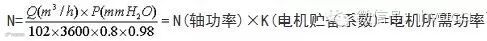 N1(千瓦)=Q流量(m3/h)×全压P(公斤/m2)/(3600×102)
