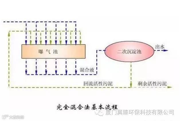 完全混合法的流程与传统活性污泥法相同,它是针对传统活性污泥法的2种缺点所作的改进。它的区别在于:混合池在曝气池中充分混合循环,回流污泥与入流污泥废水进入曝气池中立即与原来的混合液充分混合。其特点是:曝气池中各点水质基本相同,即废水有机物浓度的活性污泥浓度各点几乎一致。因此,池中各部分的工作情况也差不多完全一样。这样完全混合法曝气池中各部位需氧量均匀,不存在氧气的浪费;另外完全混合法较能适应冲击负荷的变化,这是因为入流废水与原混合液充分混合稀释,波动的水质得到了均化。
