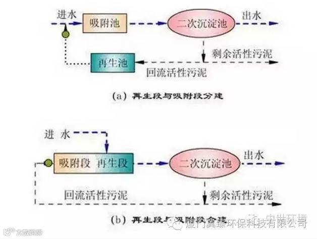 其运行特点是将活性污泥对有机物的降解的两个过程(吸附和代谢降解)分别在各自的反应器(吸附池和再生池)内进行。这种方法可以充分提高活性污泥的浓度,降低有机营养物和微生物之比,是利用活性污泥的物理作用(吸附作用)进行污水处理的方法。这种方法包括有污水和回流污泥相混合,进行污泥吸附的曝气池以及回流污泥进行氧化的再暖气。为了维持微生物的低能量,使其很好的形成并保持污泥块,这样可使活性污泥的吸附能力显著提高。