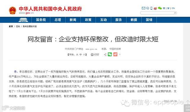 李:李总理您好,近期出台了一系列措施抑制大气的持续恶化,我们镇上也在积极配合工作。我镇是全国铝加工行业的一个很重要的聚集地,年产值200万吨以上,为社会提供了大量的就业岗位。目前环境整改,大量企业停产整顿。实业兴邦,但实体企业的日子真的不好过。环境整改很支持,但是感觉还有些许问题。铝板厂现在都是使用煤气发生炉(燃煤锅炉),几个月前环保部门监督加了脱尘脱硫装置,然后可以继续使用,几个月后净化后的煤气发生炉也不能用了,必须全部改成天然气。改为天然气这种清洁能源,我也很理解,保护环境人人有责嘛,但是时限是不是太短了?7月21日通知下达,7月25日就要开始实施煤改气,不然就停产改造。每个企业都有自己的难处,资金链、合同等等方面,企业拥护政府,支持政策,希望政府也能切实考虑企业实际情况,制定合理整改措施。