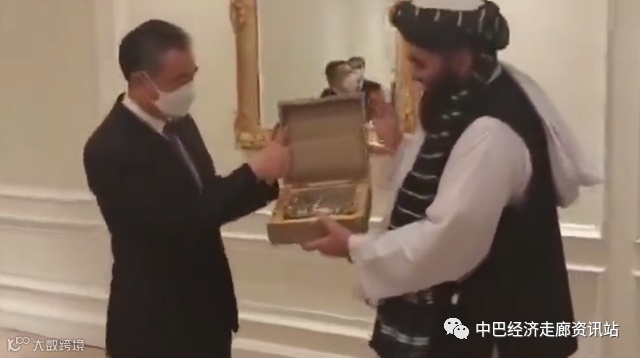 今年10月26日,在卡塔尔王毅会见阿富汗临时政府代理外长穆塔基,穆塔基向王毅赠送了一份松子作为礼物。