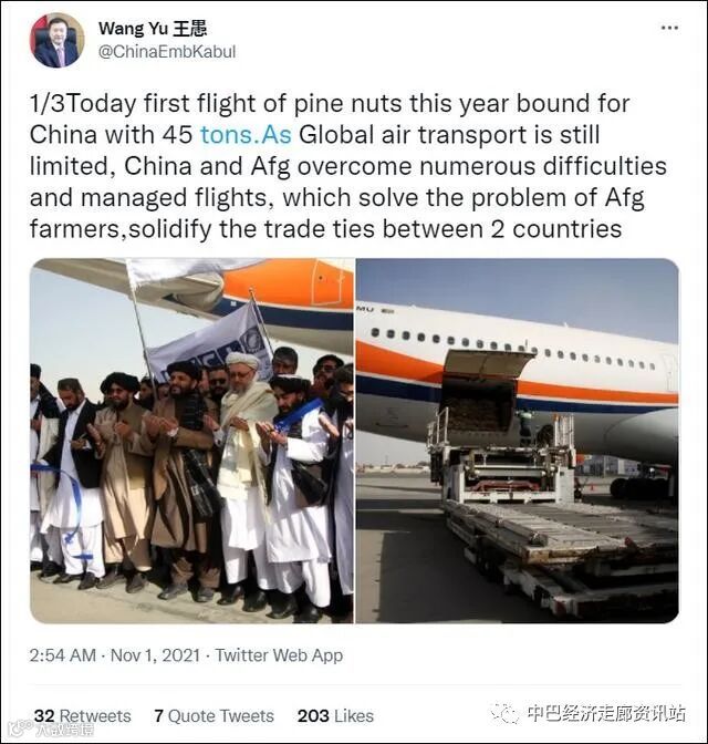 综合阿富汗当地媒体“黎明”电视台、中国驻阿富汗大使王愚推特消息,10月31日,一批45吨重的阿富汗松子乘货机顺利发往上海。这是阿富汗塔利班夺取政权后,阿富汗首次进行对华货物出口。