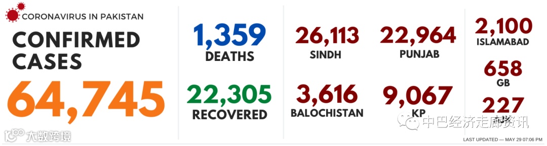 截至5月30日凌晨,巴基斯坦新冠肺炎确诊病例总数增至64745例,其中,信德省26113例,旁遮普省22964例,俾路支省3616例,吉尔吉特—巴尔蒂斯坦(GB)地区658例,开普省9067例,伊斯兰堡2100例,查谟克什米尔227例。死亡1359例,治愈22305例。