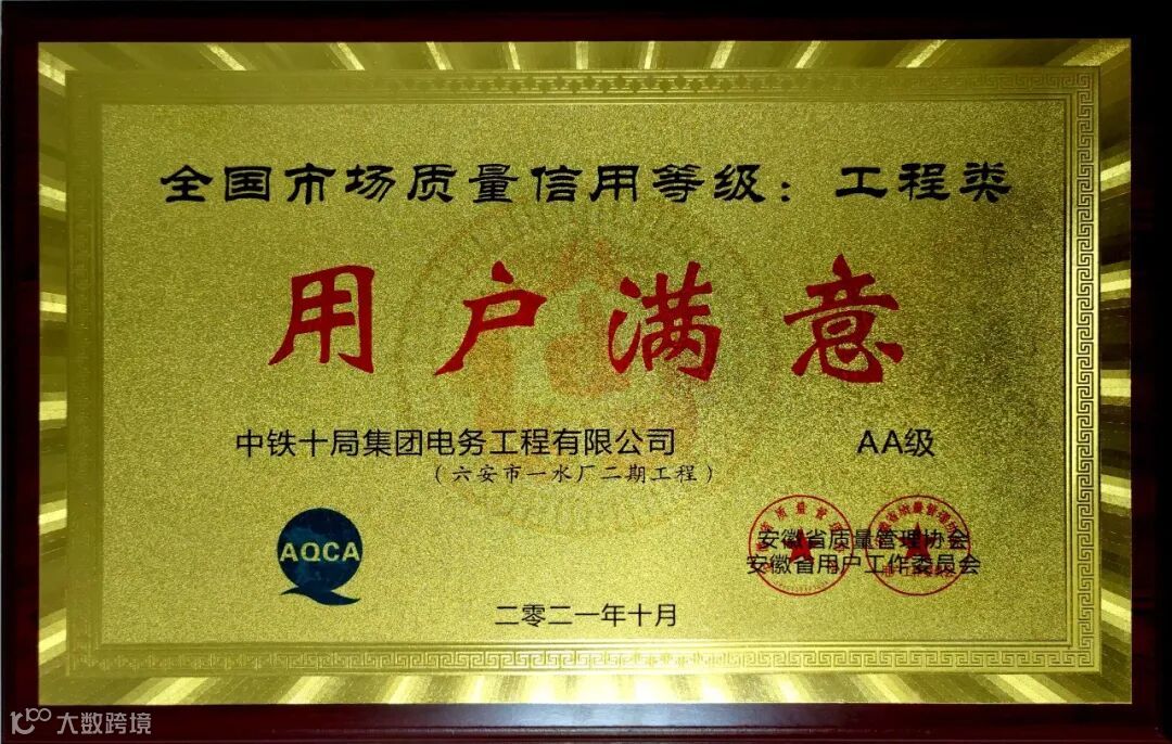 喜报!近日,由公司电务第一项目部施工的六安一水厂二期工程荣获全国市场质量信用评价的“用户满意AA级”项目 。