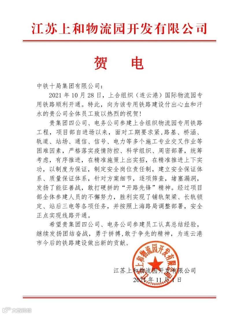 10月28日,由公司电信工程分公司、电务第四项目部施工的上合组织(连云港)国际物流园专用铁路正式顺利开通,江苏上和物流园开发有限公司发来贺电表示祝贺。