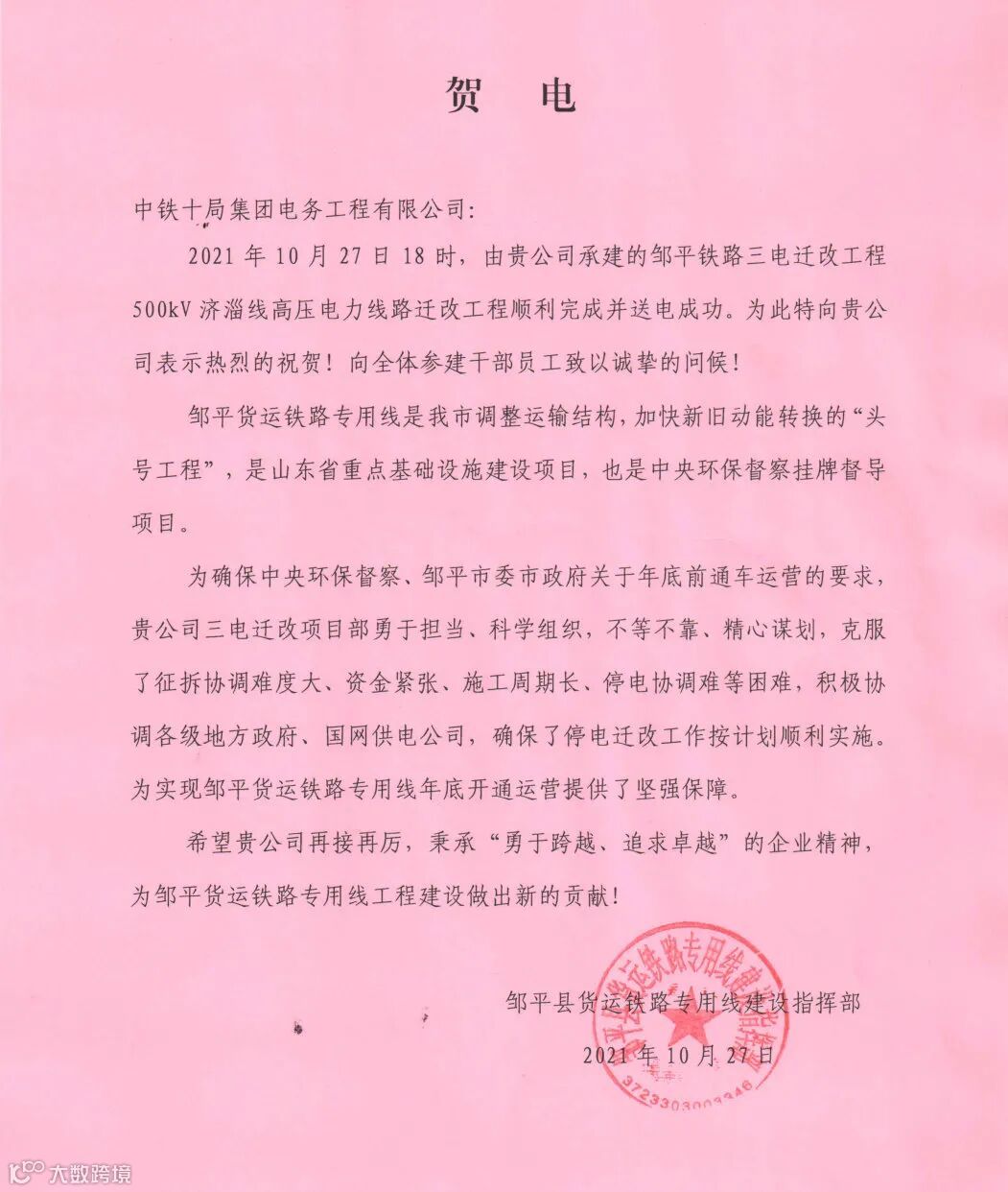 10月27日,由公司机电综合第二项目部施工的邹平铁路三电迁改工程500kV齐淄线超高压电力迁改顺利完成,邹平货运铁路专用线建设指挥部发来贺电表示祝贺。