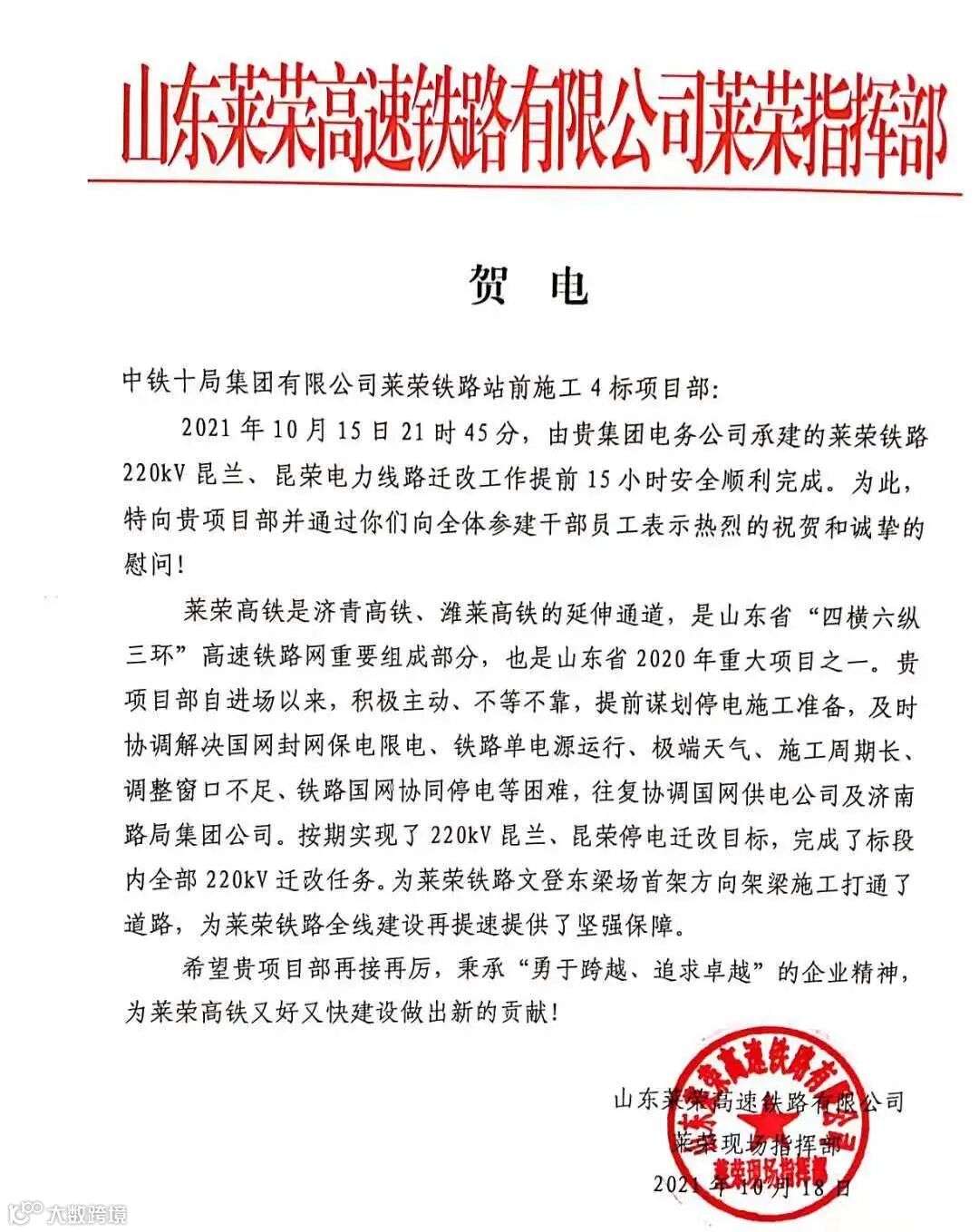 10月15日,由公司机电综合第二项目部施工的莱荣铁路220kV昆兰、昆荣电力线路迁改施工提前15小时顺利完成,山东莱荣高速铁路有限公司莱荣现场指挥部发来贺电表示祝贺。