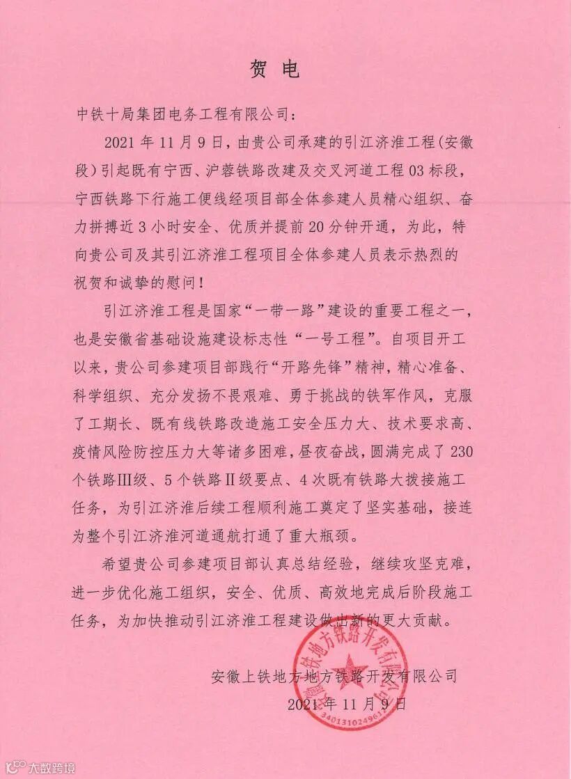 11月9日,由公司电务第一项目部、电气化第三项目部施工的引江济淮引起既有宁西下行便线四电工程顺利开通(Ⅱ级施工),安徽上铁地方铁路开发有限公司发来贺电表示祝贺。