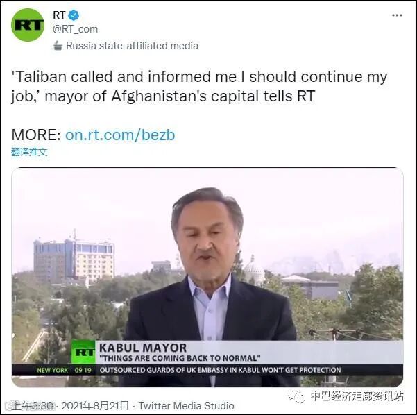 8月20日,阿富汗首都喀布尔市市长苏丹祖伊在接受俄媒“今日俄罗斯”采访时表示,塔利班刚进入喀布尔,自己就接到了他们的电话,塔利班通知他回去工作。