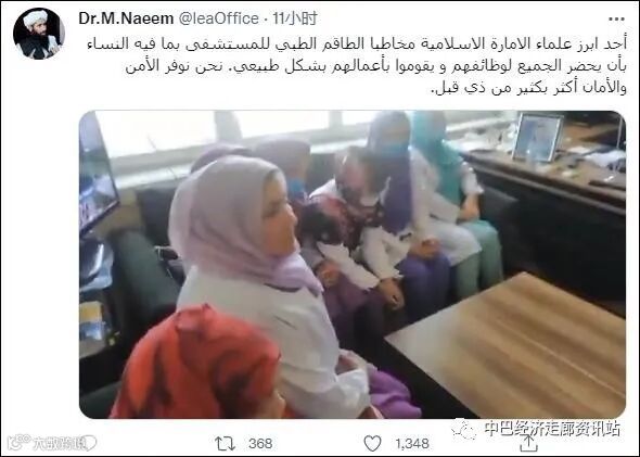 △女性医务工作者与塔利班成员谈话 截图自阿塔政治办公室发言人穆罕默德·纳伊姆推特