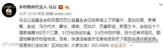 马云公益基金会和阿里巴巴公益基金会已经联络上了阿富汗、孟加拉国、柬埔寨、老挝、马尔代夫、蒙古、缅甸、尼泊尔、巴基斯坦、斯里兰卡,会给这十个国家捐赠180万个口罩、21万检测试剂盒、3.6万件防护服,另外还有呼吸机、额温枪等医疗防疫物资。目前,快速运输医疗应急物资到很多国家变得非常困难,但是我们会加油!亚洲加油!大家加油!GO ASIA!