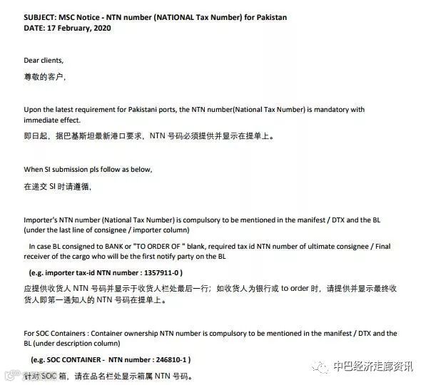据巴基斯坦最新港口要求,NTN号码必须提供并显示在提单上。