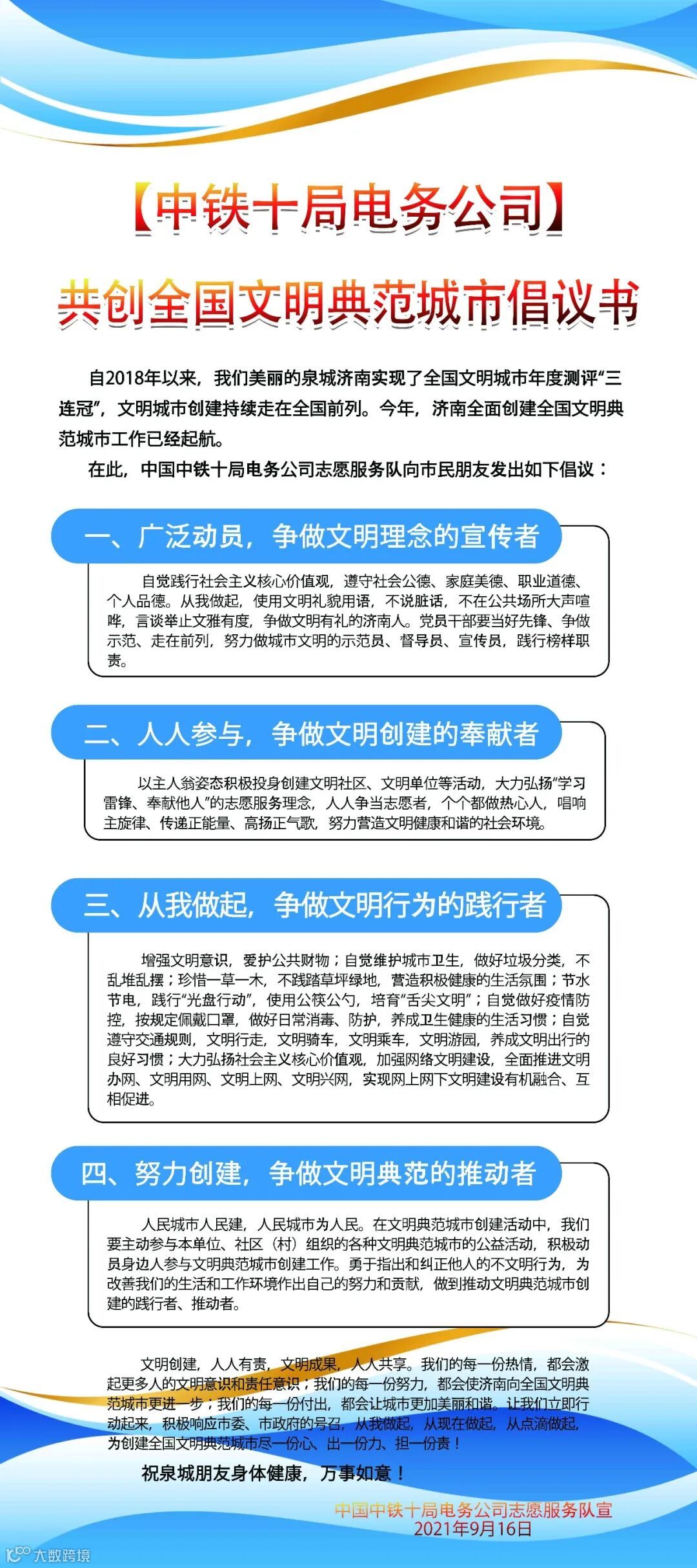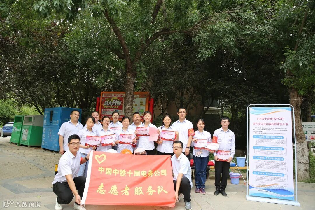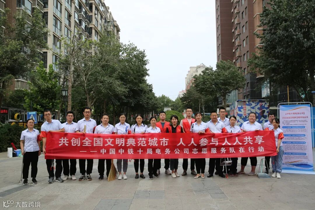 共创全国文明典范城市,人人参与,人人共享,中铁十局电务公司志愿服务队在行动。