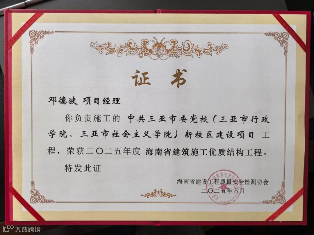 公司负责施工的中共三亚党校(三亚市行政学院、三亚市社会主义学院)新校区建设项目,荣获2025年度"海南省建筑施工优质结构工程”。(摄影/孙洪波)