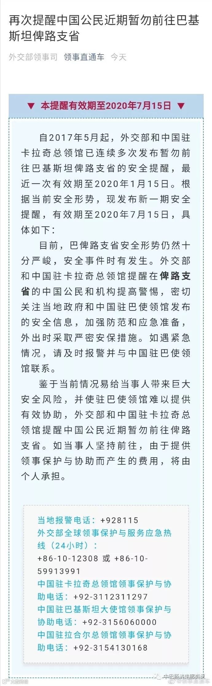 据外交部领事保护中心官方微博发布,目前,巴基斯坦巴俾路支省安全形势仍然十分严峻,安全事件时有发生。外交部和中国驻卡拉奇总领馆已发布新一期安全提醒,有效期至2020年7月15日。