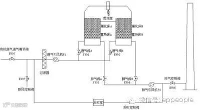 排放自工艺含VOCs的废气进入双槽RCO,三向切换风阀(POPPETVALVE)将此废气导入RCO的蓄热槽(EnergyRecoveryChamber)而预热此废气,含污染的废气被蓄热陶块渐渐地加热后进入催化床(CatalystBed),VOCs在经催化剂分解被氧化而放出热能于第二蓄热槽中之陶块,用以减少辅助燃料的消耗。陶块被加热,燃烧氧化后的干净气体逐渐降低温度,因此出口温度略高于RCO入口温度。三向切换风阀切换改变RCO出口/入口温度。如果VOCs浓度够高,所放出的热能足够时,RCO即不需燃料。例如RCO热回收效率为95%时,RCO出口仅较入口温度高25℃而已。