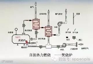 直燃式焚烧炉的设计是依废气风量,VOCs浓度及所需知破坏去除效率而定。操作时含VOCs的废气用系统风机导入系统内的换热器,废气经由换热器管侧(Tubeside)而被加热后,再通过燃烧器,这时废气已被加热至催化分解温度(650~1000℃),并且有足够的留置时间(0.5~2.0秒)。这时会发生热反应,而VOCs被分解为二氧化碳及水气。之后此一热且经净化气体进入换热器之壳侧(shellside)将管侧(tubeside)未经处理的VOC废气加热,此换热器会减少能源的消耗(甚至于某适当的VOCs浓度以上时便不需额外的燃料),最后,净化后的气体从烟囱排到大气中。